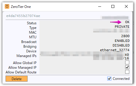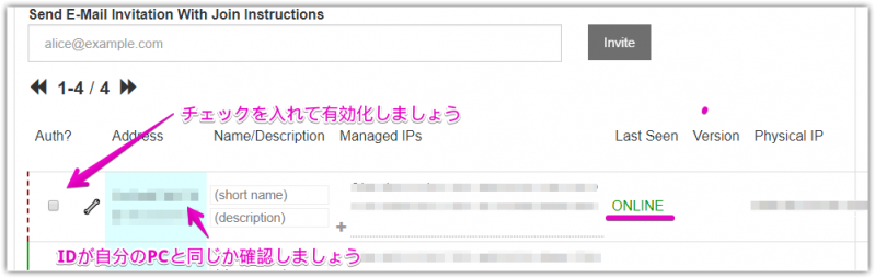 自分のマシンのZeroTier Oneをオンライン状態にします