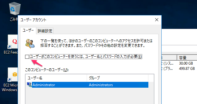 →cmdより「netplwiz」を起動、「ユーザーがこのコンピュータ…」のチェックを外す。