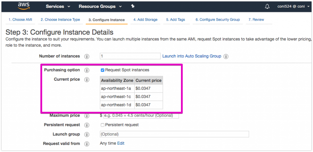 Purchasing option を選択し、Spotインスタンスで起動する設定をしましょう。