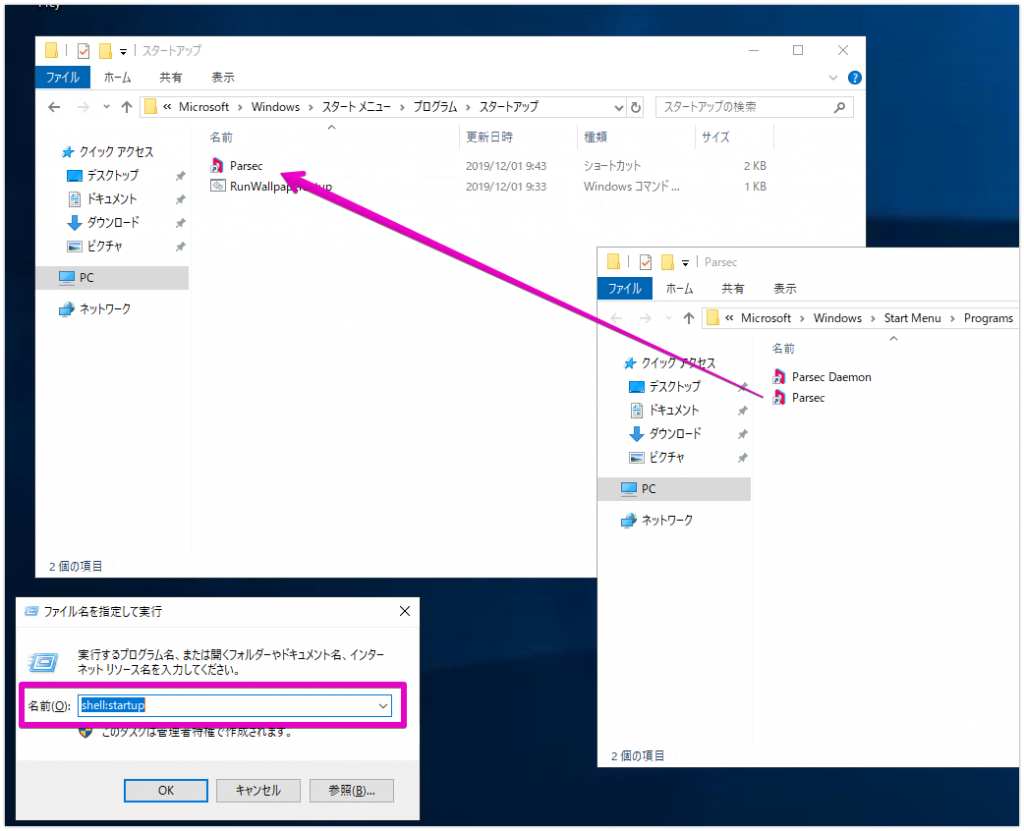 Windows + R で呼び出し、”shell:startup” でスタートアップを開くと簡単です。