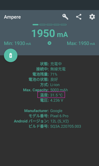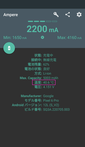 比較条件はPixel 6 Pro 純正カバー付きでバッテリー残量50%から60〜70%くらいまで充電した時の温度を測定。画面消灯。