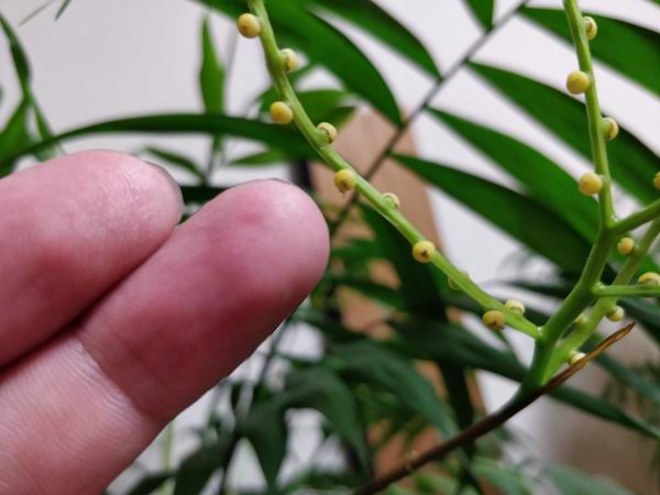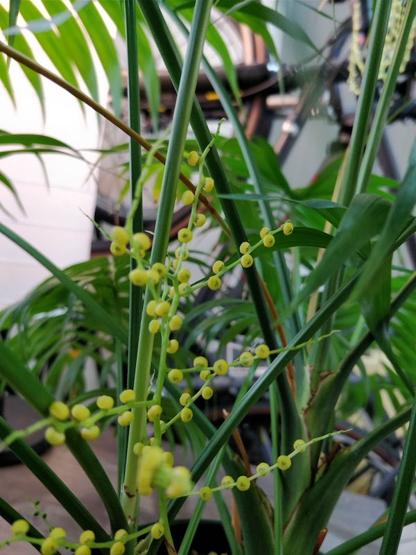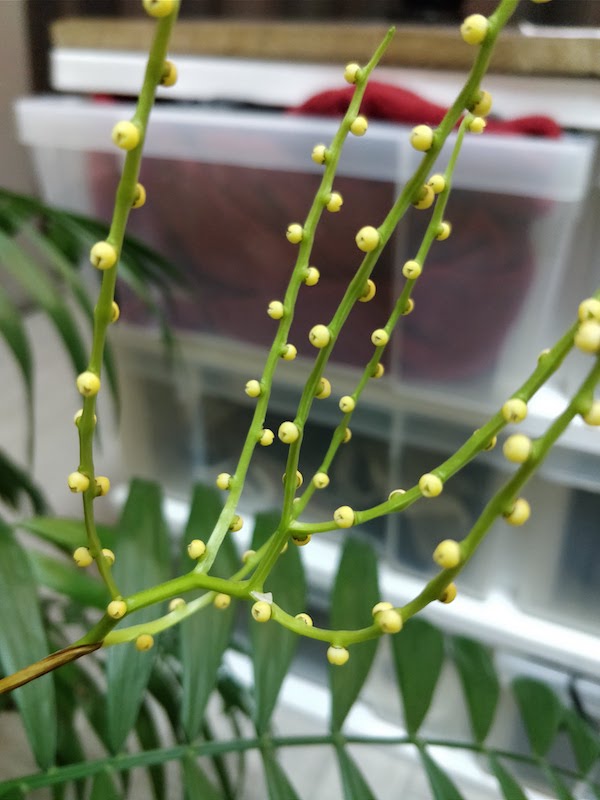 自宅の10年目、テーブルヤシの花が咲いたので、受粉を行いました。