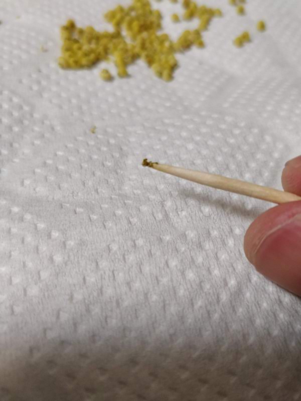 見辛いですが、雌花に「がく」を複数個詰め込みます。がくは粘着質なので爪楊枝の先でもなんとか詰め込むことは出来ます。要は花粉がつけば良いってことですね。